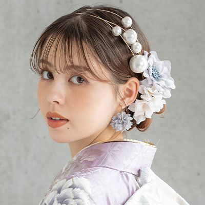 存在感のある大ぶりなパールカチューシャと儚い色使いの髪飾りが上品で相性抜群。