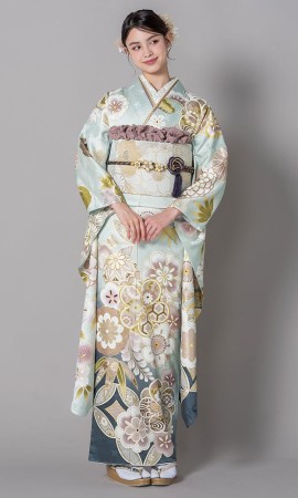 振袖の色めの中ではめずらしい翡翠色の金彩友禅。御所車に瑞雲重ねの古典柄に菊や桜の幻想花を入れたかわいらしい振袖です。伝統技法の金箔も入れた格調ある意匠美。成人式には、翡翠色のかわいい振袖で!