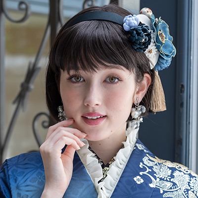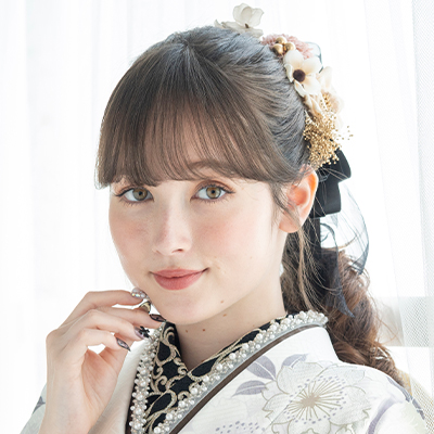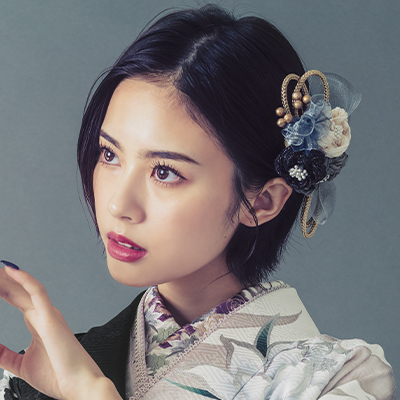 あえてシルバーの髪飾りにすることで粋な印象へ。