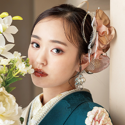髪飾りは振袖と同系色で合わせてさらに大人っぽく。