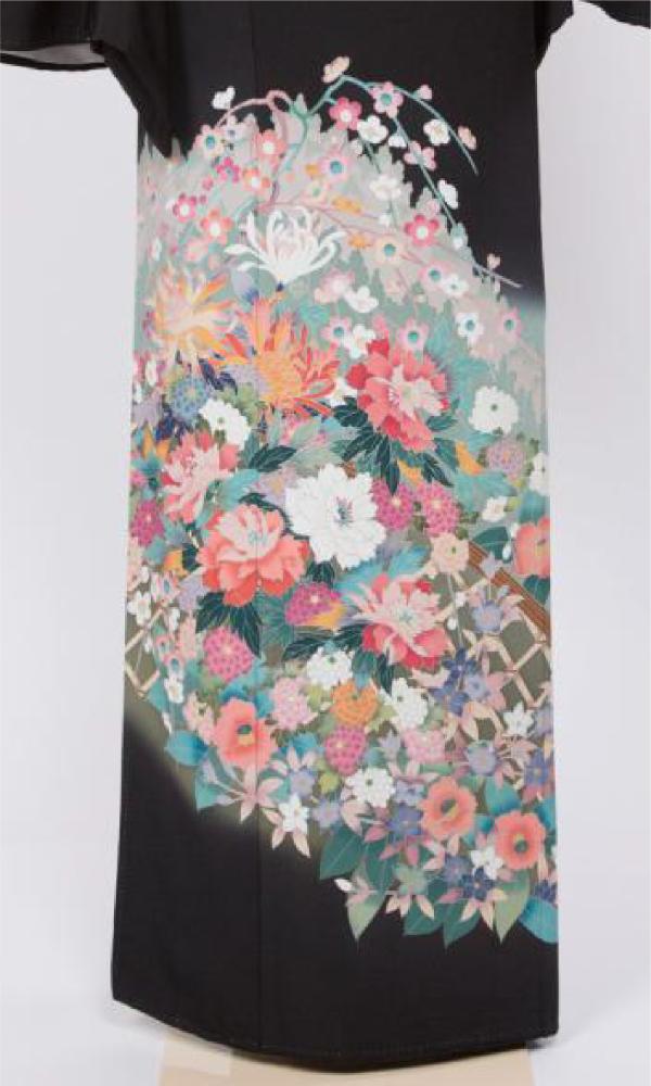 手描きで日本を代表する式の草花を描いた作家物の本加賀友禅です。菊、牡丹、梅、椿と一筆一筆、花芯や一葉に至るまで加賀友禅の独特のタッチが見事に描かれています。留袖の中でも最高級の別格の逸品です。