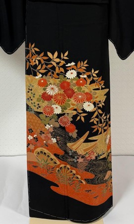水の流れに「源氏車」と日本の四季の草花を描いた留袖です。色彩に朱赤系が入り、華やかに映ります。30代、40代の方におすすめです!