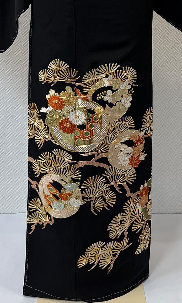 円形熨斗文様の中に菊、橘、藤、モミジなど相良刺繍などが、全体に施されてます。個性的な柄と最高にエレガンスな逸品は見る方すべての注目の的です!